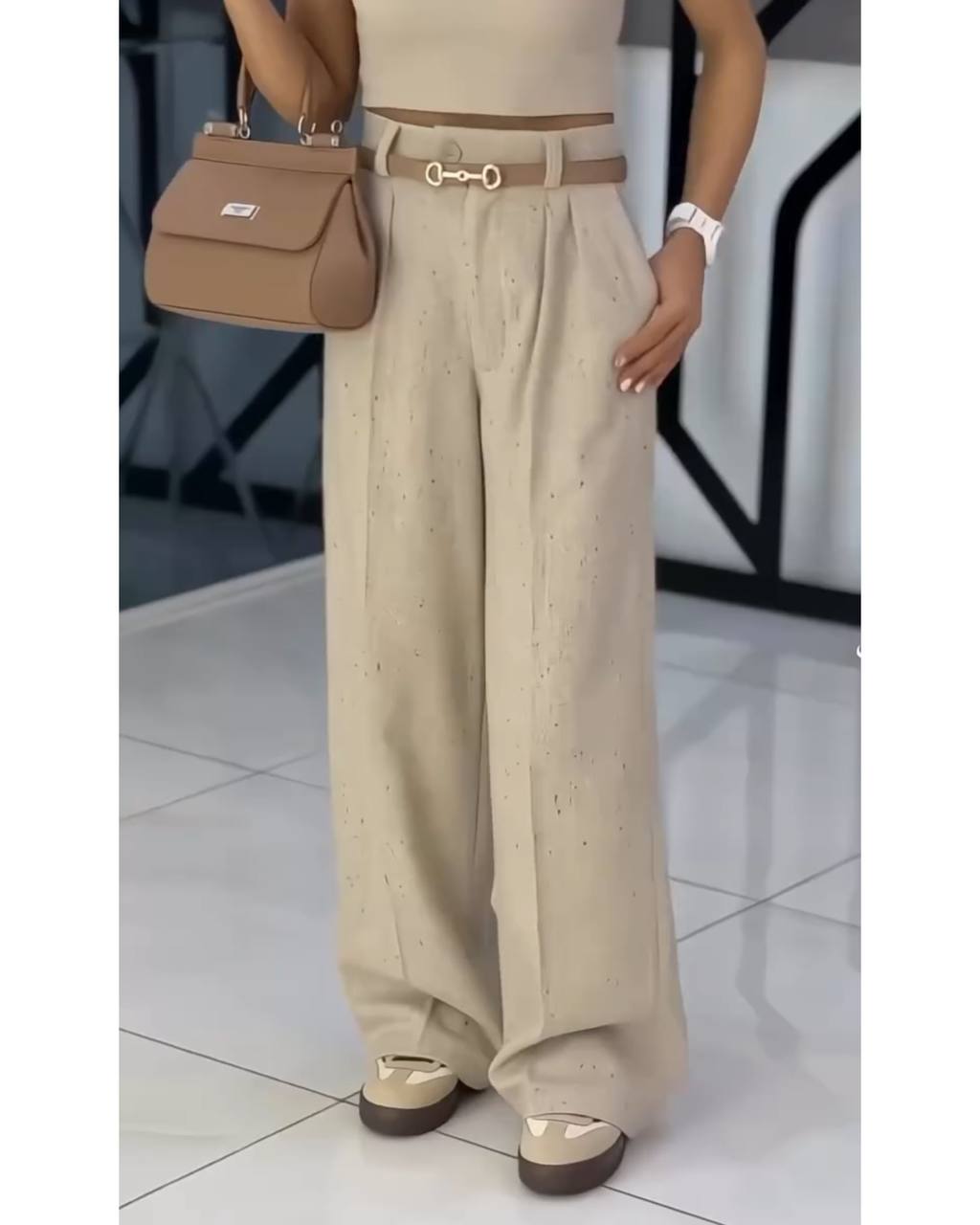 🍁 قد شلوار: حدود ۱۰۷ سانتیمتر – بگ و راحت، اما شیک و مجلسی