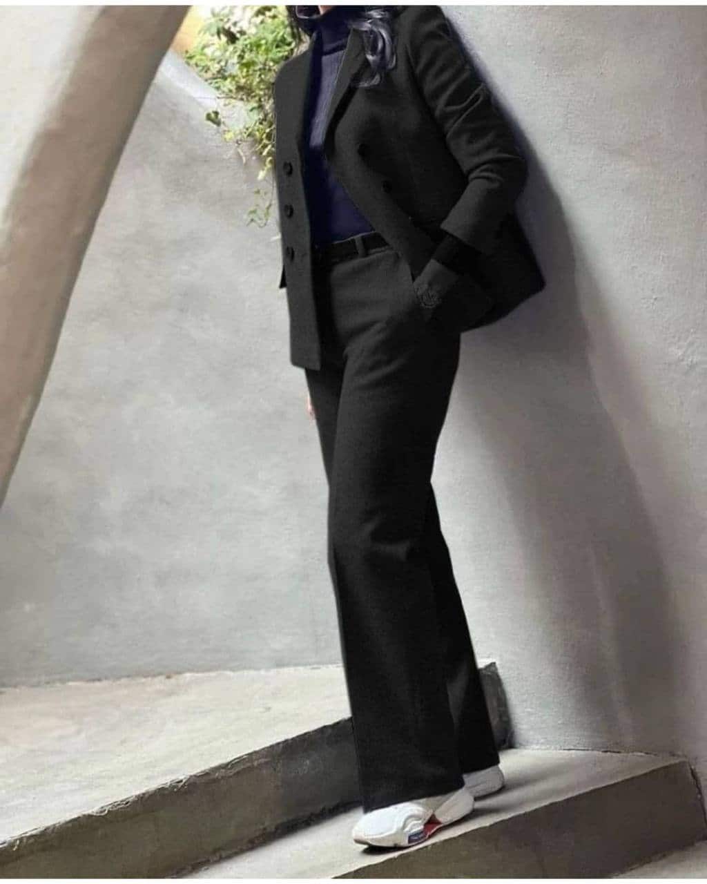 👗 کت این ست، قدش حدود ۶۲ سانتیمتره؛ یعنی نه خیلی کوتاهه که فکر کنی بلوز شد، نه خیلی بلند که بگی مانتوئه!